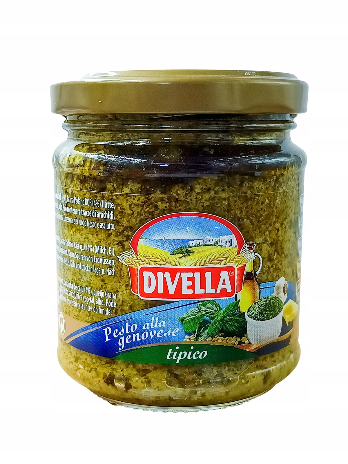 Skład: bazylia (53%), olej słonecznikowy, oliwa extra vergine, orzeszki nerkowca (4%), ser Grana Padano DOP (4,%), ser Pecorino Romano DOP, orzeszki pinii (1,5%), sól, regulator kwasowości: (kwas mlekowy), włókno roślinne, czosnek.