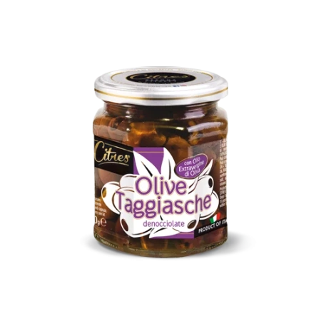 Oliwki bez pestek Taggiasche to mięsiste, czarne oliwki o słodkim, delikatnym smaku i owocowym zapachu, z oliwą z oliwek z pierwszego tłoczenia.