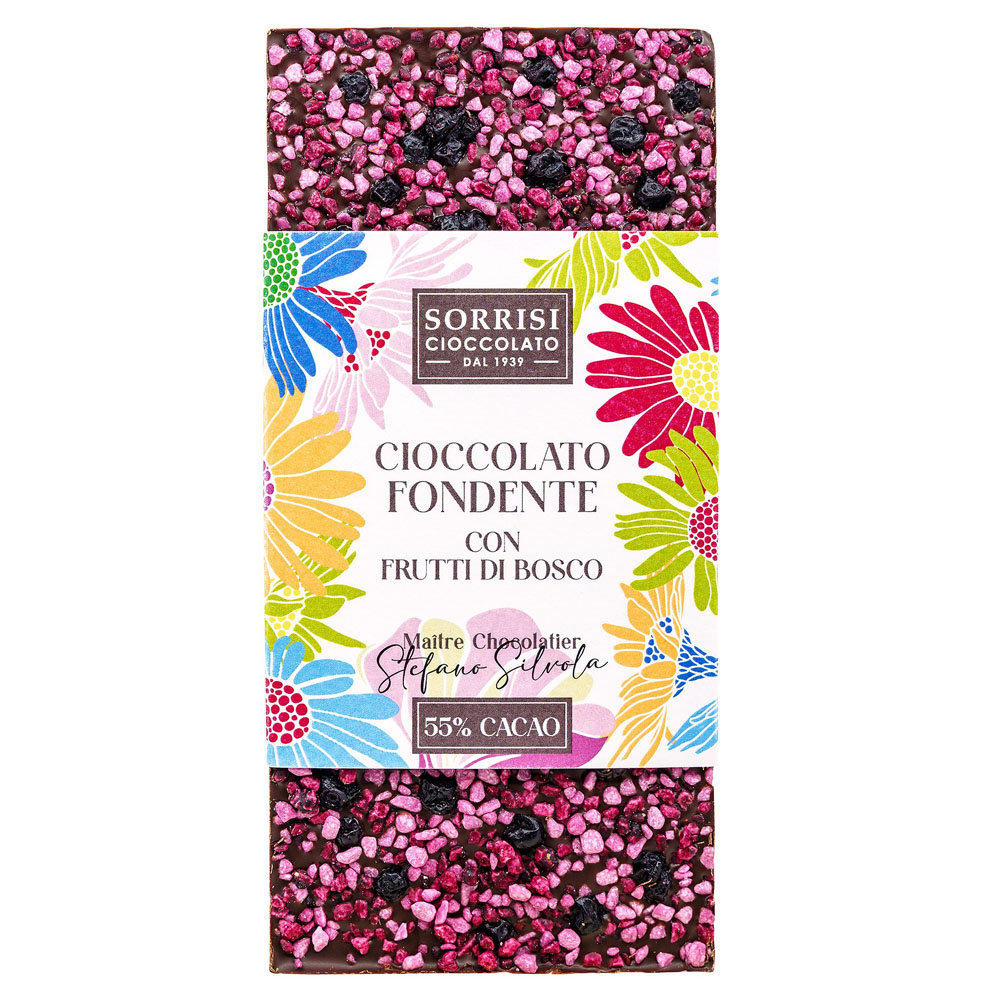 Mleczna czekolada o czystym i niepowtarzalnym smaku kakao wzmocnionym słodyczą owocowych nut, ręcznie dekorowana chrupiącą granolą o smaku malin i jeżyn.