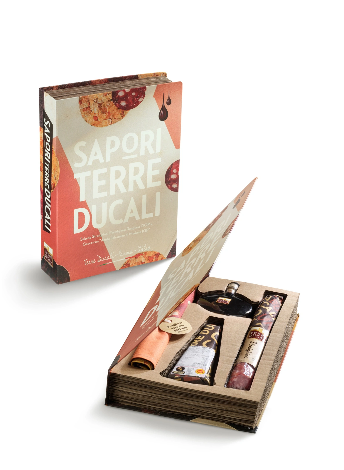 Zestaw prezentowy w ozdobnej książce ocet, ser i salami Terra Ducali